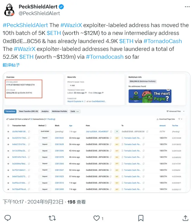 數據:WazirX 黑客地址轉出第十批 5000 枚 ETH,累計洗白 5.25 萬枚 ETH